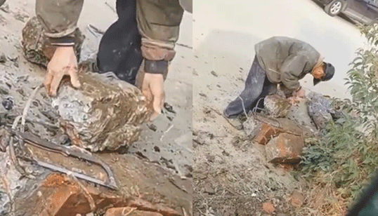 老人凿砼取钢筋换钱手掌凿破流血不止 挖机师傅一个动作温暖人心