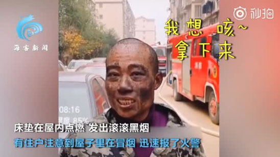 大叔为图省事在室内焚烧床垫 结果被熏成小黑人