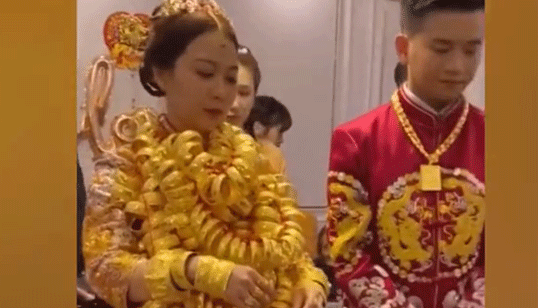 婚礼现场新娘戴满金首饰,脖子手臂发金光网友傻眼:承包了个金店