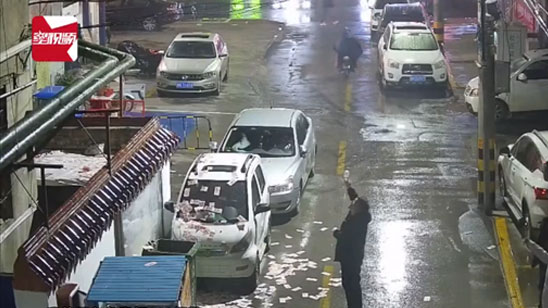 楼上撒下“现金雨” 男子冒雨举吊瓶守护现场