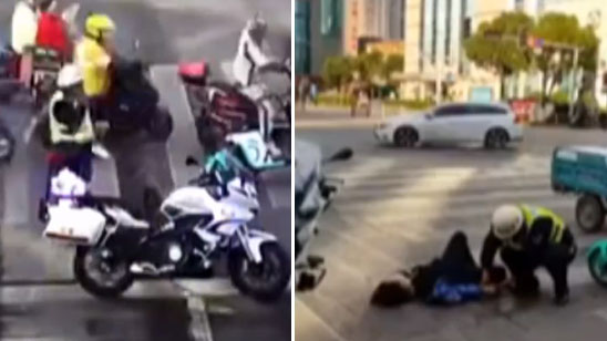 女子斑马线上倒地抽搐 交警摩托车挡道暖心守护