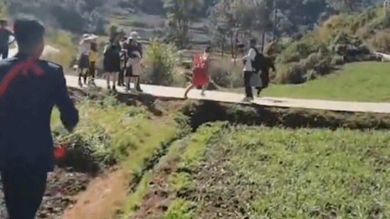 新娘子结婚路上被刁难脱鞋光脚田埂上飞奔 举着高跟鞋追打伴郎