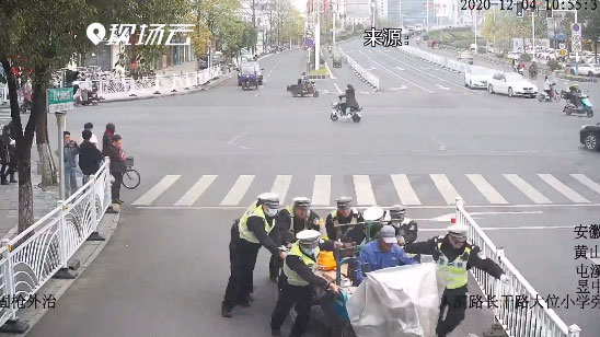 路中央8名交警一起推这辆三轮车 咋回事?