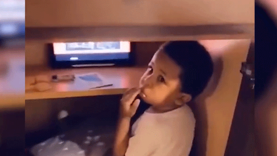 可爱!宝宝在“秘密基地”吃零食、看动画 被妈妈发现后一脸呆萌