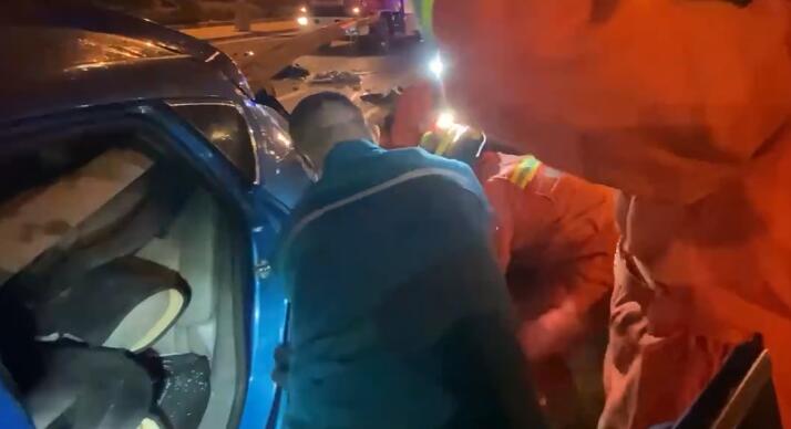 轿车撞上护栏被戳穿 被困男子呻吟中求消防员:先救我媳妇