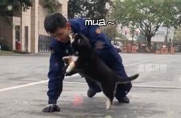 治愈!消防员做俯卧撑被狗狗偷亲