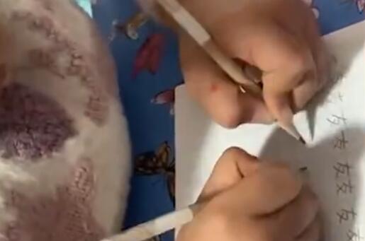 7岁女孩双手同时写字字迹工整 网友:双卡双待,不怕作业多了