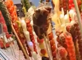 花式糖葫芦 东北摊主用猪蹄辣条做糖葫芦