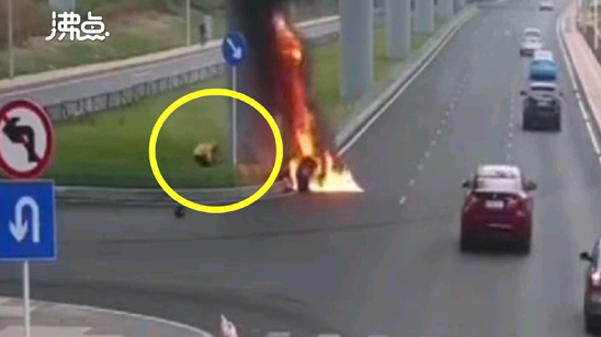 电动车撞上桥墩后爆燃 外卖小哥冲进火海救同行