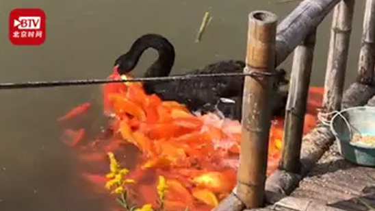 什么情况?黑天鹅衔食喂水中锦鲤