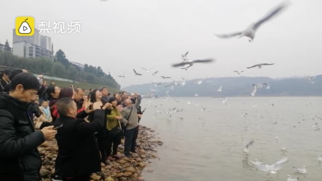 重庆江津迎数百只红嘴鸥,市民挤满江滩围观