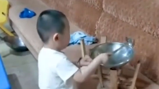 萌娃手拿炒锅模仿炒菜颠勺快速翻炒还转圈 网友:颠得很有灵魂