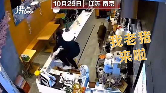 野猪闯进奶茶店表演跨栏 一米高台纵身一跃身手敏捷