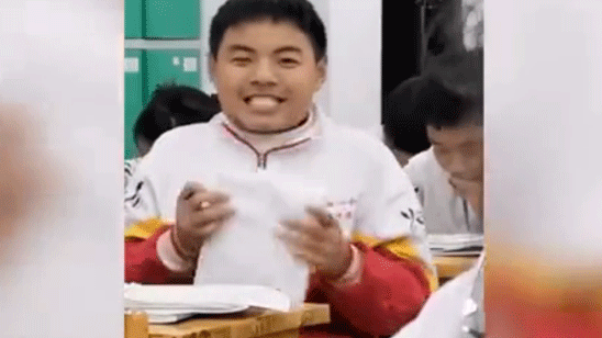 男同学做题时姿势与众不同 解出答案后表情超丰富还兴奋地咬本子