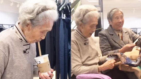 百岁奶奶和闺蜜一起逛街 还尝试了珍珠奶茶