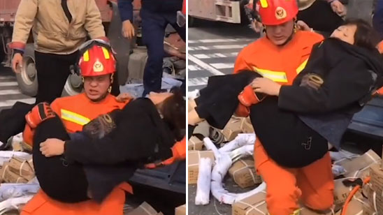 最有力的拥抱!消防员摔倒仍稳抱被困者