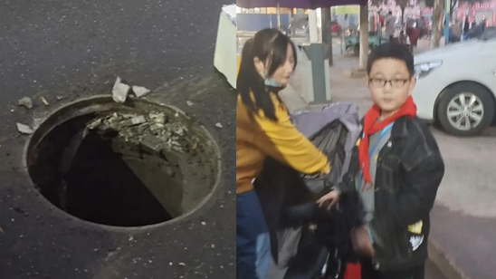 小学生雨中坚守深不见底的井口:防止路人受伤