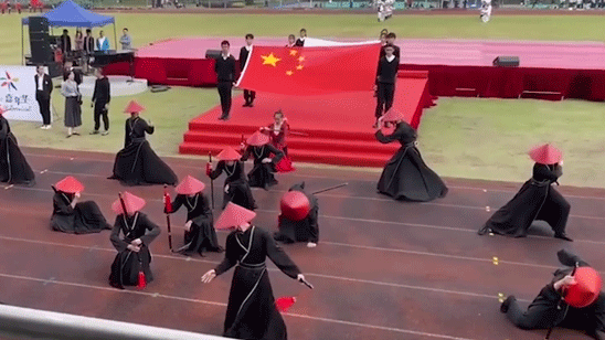 学校运动会开幕式现古装跳舞方阵 学生化身侠客舞剑空翻惊艳全场