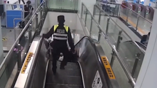90后辅警5秒跨栏救摔倒老人 飞身跨过围栏紧急摁停扶梯救人