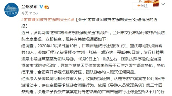 导游强制游客买玉后续:吊销导游证 旅行社停业整顿
