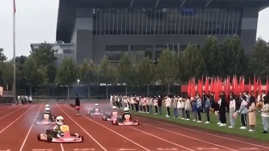 超帅!高校运动会现赛车方阵 多辆赛车跑道上并排疾驰引全场欢呼