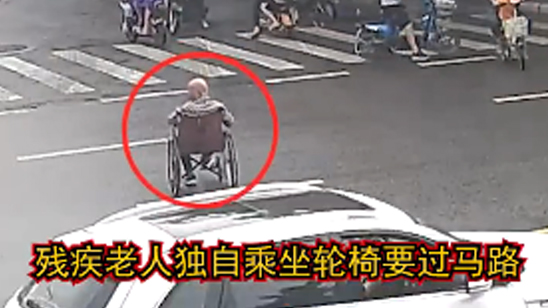 老人独自乘坐轮椅要过马路,车来车往,幸亏有他们……