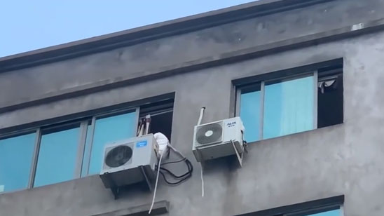 浙江一女子因感情纠纷坐窗台欲轻生 消防到场“一脚飞踹”救下