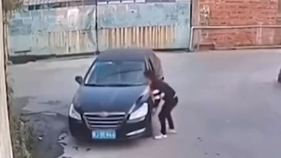 男司机开车过90度弯8次尝试均失败 无奈徒手移车 结果惊呆