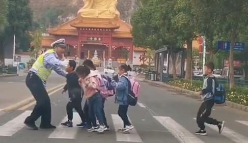 可可爱爱!交警雀跃式护送小朋友过马路