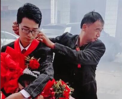 新郎听到鞭炮声细心捂住新娘耳朵 身后的父亲默默捂住了新郎的耳朵