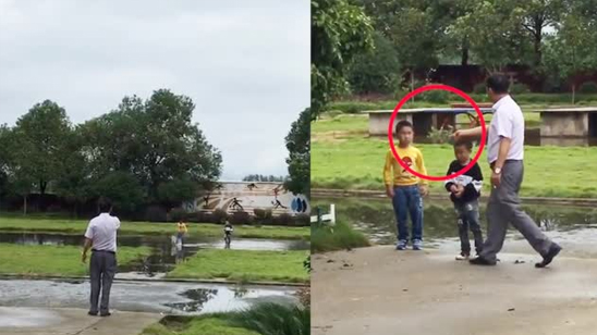 怒气冲冲抵达战场 校长拿小树枝教训踩水男孩