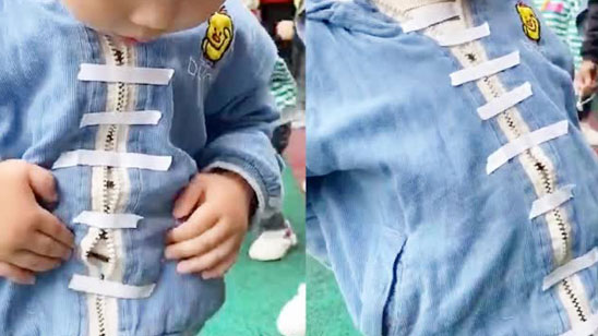 老师用胶带代替男孩外套上的拉链 男孩鼓起小肚子炫耀