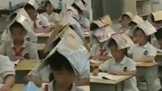 小学生头顶课本写字矫正坐姿 网友:还是老师有办法