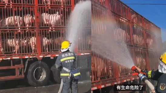 132头猪遇堵车被关15小时险热死 消防赶来喷水救命