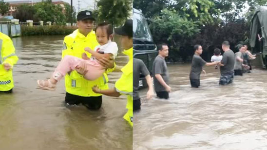 青岛暴雨幼儿园被积水围困 民警武警搭起“一座桥” 接力抱孩子上车