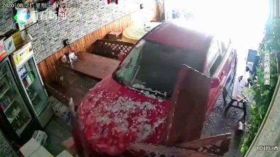 惊魂!女子驾车冲进饭店 玻璃大门瞬间被撞粉碎