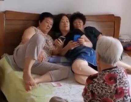 91岁母亲看3个女儿玩手机 盘坐在旁静静陪伴