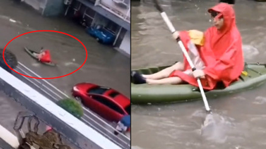 道路积水,浙江一医生划船上班爆红,医生:划了50分钟还是迟到了