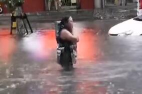 女子在马路积水中游泳险遭汽车碾压