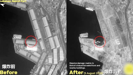 卫星图对比黎巴嫩大爆炸前后:建筑“消失” 港口炸出140米黑洞