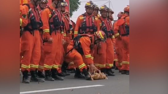 相处十多天流浪狗送别消防员 上来就被“放倒”