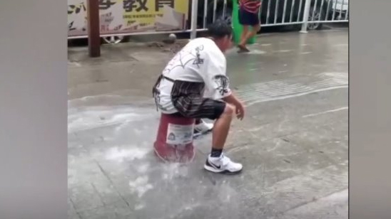 消防栓喷水小伙用桶罩上淡定坐住:130多斤,用别的东西压不住
