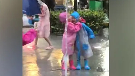 可爱爆了!3岁弟弟玩喷泉被撞倒 4岁姐姐一边“怒吼”一边抱住弟弟安慰