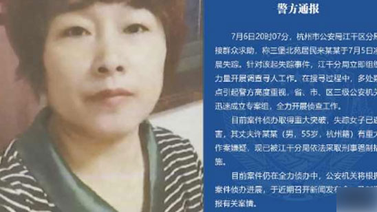 警方通报杭州女子失踪案:来女士已遇害 丈夫有重大作案嫌疑
