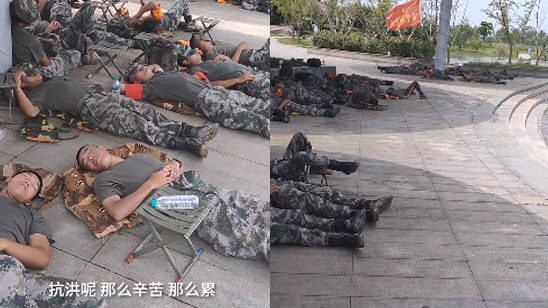 抗洪官兵饭后席地午休 公园保安暖心守护防止路人打扰