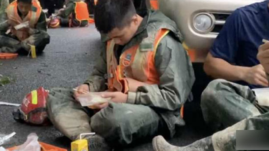 抗洪消防员回应手捧盒饭睡着:抢险13小时,怕家人看到担心