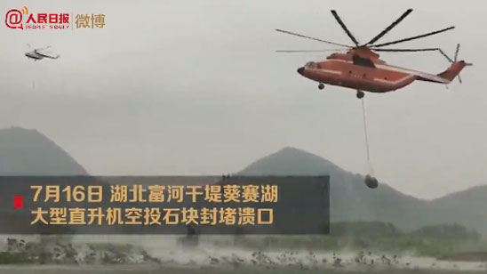 湖北首次启用大型直升机空投网兜石块封堵溃口