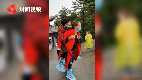 为完成老人10年的心愿 女儿们轮流背86岁母亲爬山