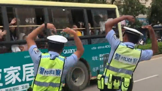 执勤交警比心祝福考生 卖萌动作引考生欢呼