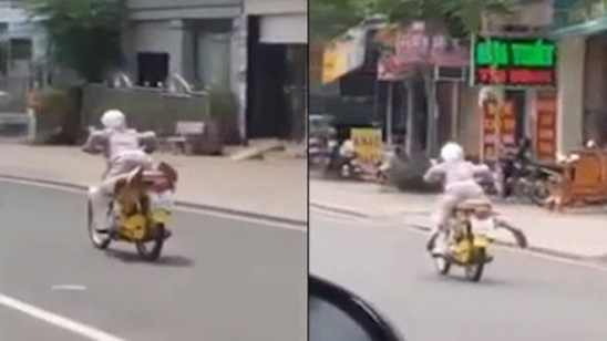 女子骑摩托上路,先站后趴如演杂技,看呆路人